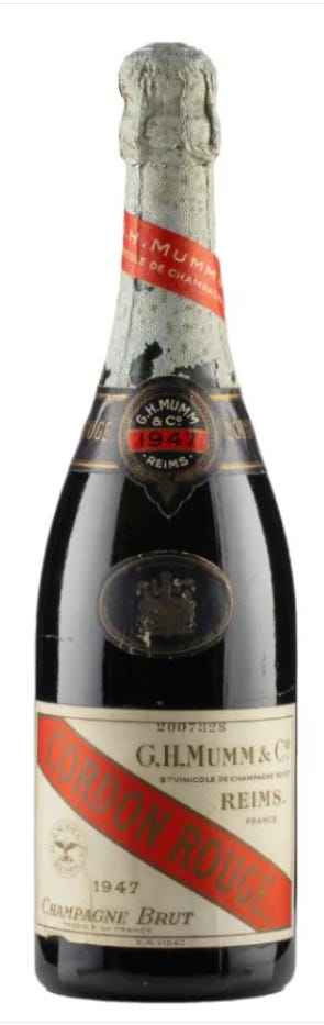 Here’s a photo of a 1947 bottle of Mumm’s Champagne Brut. (I don’t know the first thing about champagne, I’m just reading the bottle.) This bottle is available at Cask Cartel online for $2,598.98